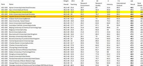 جدول تصنيف التايمز المرفق يظهر عمان الاهلية الأولى محلياً بلا منازع في المرتبة 441 ضمن الفئة 401 – 500 عالمياً