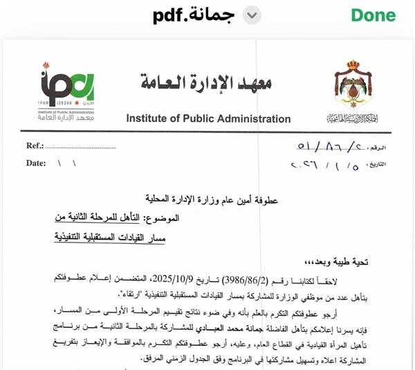جبال البلقاء الاخباري: تأهلت جمانه محمد العبادي للمرحلة الثانية واجتياز مرحلة التقييم ضمن مسار القيادات المستقبلية التنفيذية (ارتقاء)، وذلك استنادًا لكتاب معهد الإدارة العامة المتضمن نتائج المرحلة الأولى.