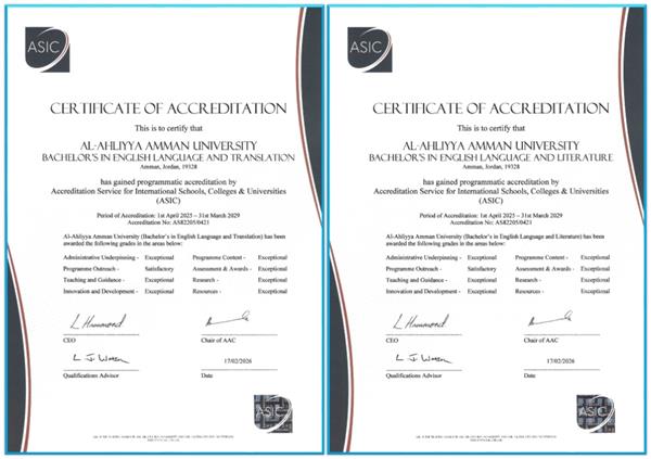 جبال البلقاء الاخباري:حققت كلية الآداب والعلوم - قسم اللغة الانجليزية في جامعة عمان الأهلية إنجازاً أكاديمياً رفيعاً بحصول برنامجي بكالوريوس اللغة الإنجليزية وآدابها واللغة الإنجليزية والترجمة على الاعتماد البريطاني ASIC وفق أعلى مستوى ضمن فئة التميّز " المستوى الاستثنائي".